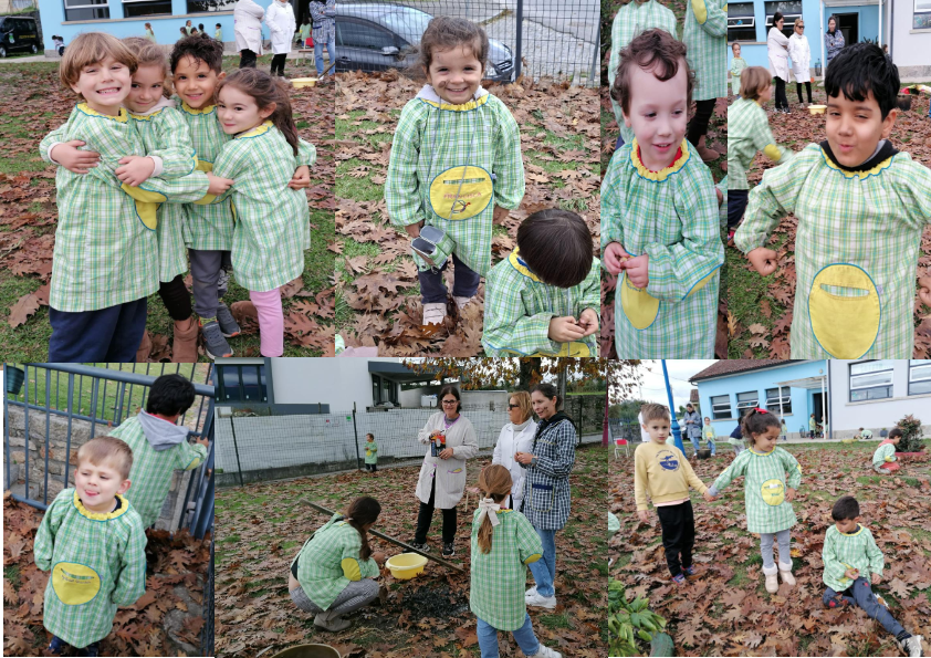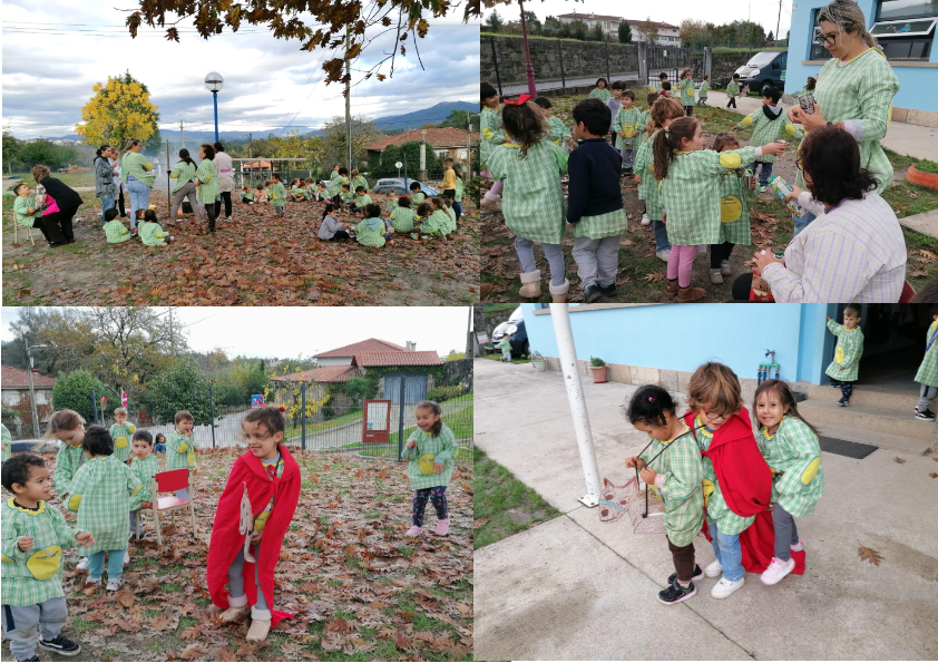 O dia 12 de novembro, depois de uns dias cinzentos e frios, trouxe-nos não só o famoso ‘Verão de São Martinho’ mas também uma festa inesquecível na nossa escola! Foi um dia de magia, onde a tradição se juntou à brincadeira mais endiabrada, celebrando o S. Martinho. O ponto alto da festa foi, claro, o nosso Magusto! Reunimo-nos todos, de coração cheio e bochechas rosadas, à volta de uma fogueira feita à moda antiga: caruma, pauzinhos e palha a crepitar alegremente. E o que dizer da estrela da tarde? Uma panela velha e furada, cheia de sal, onde as castanhas dançavam e estalavam no fogo, num espetáculo de som e fumo que nos encheu de curiosidade e entusiasmo.
